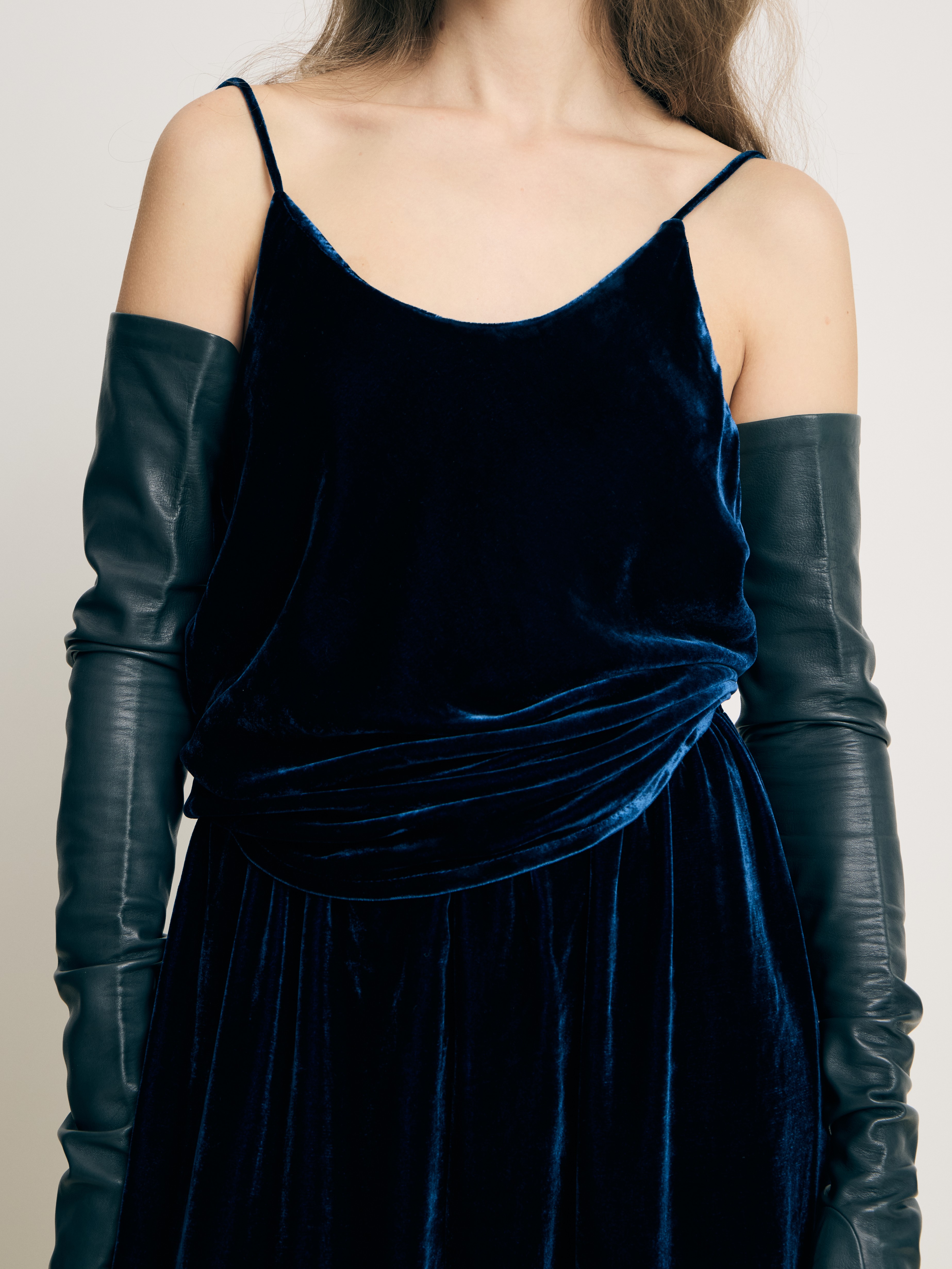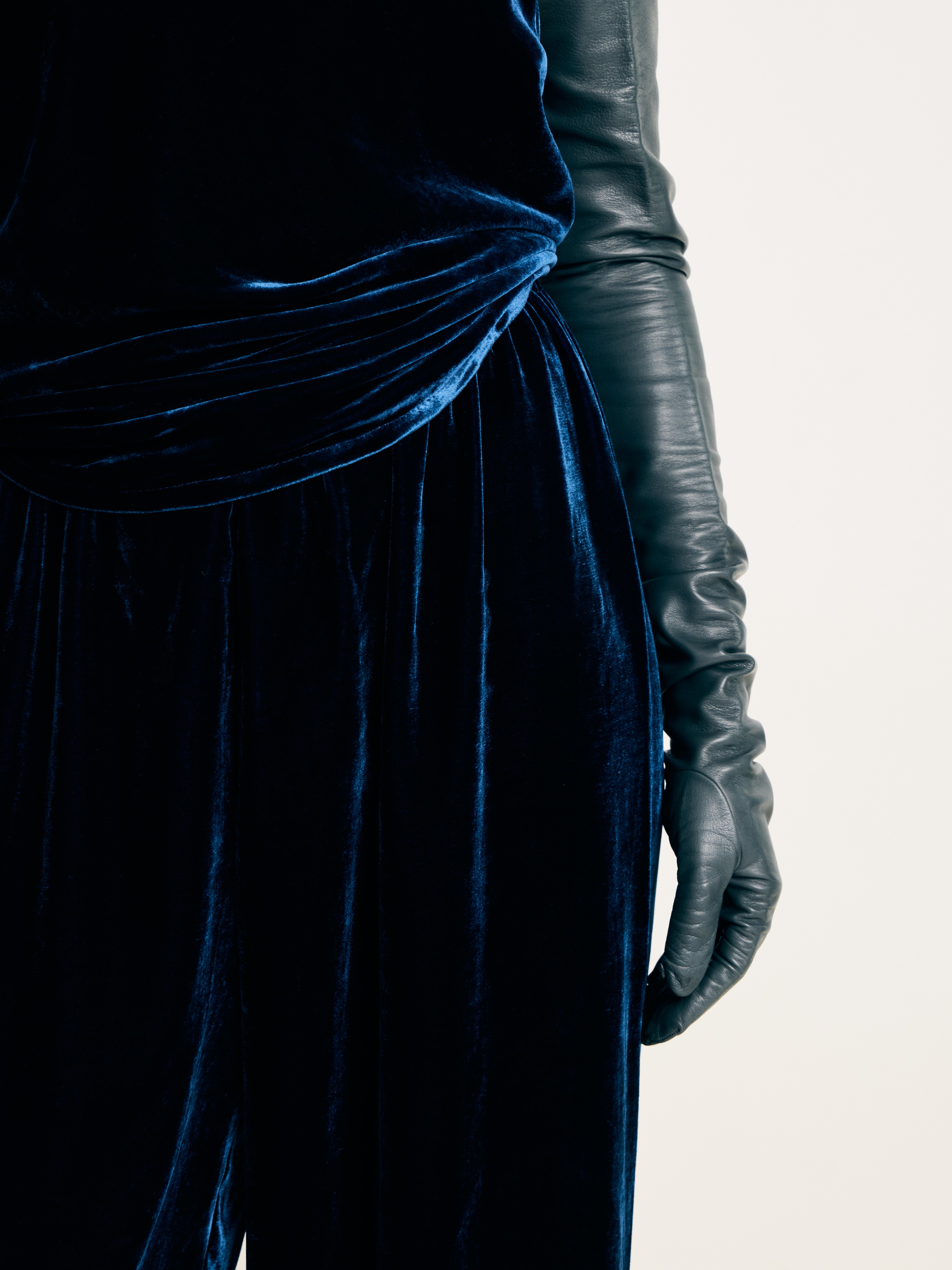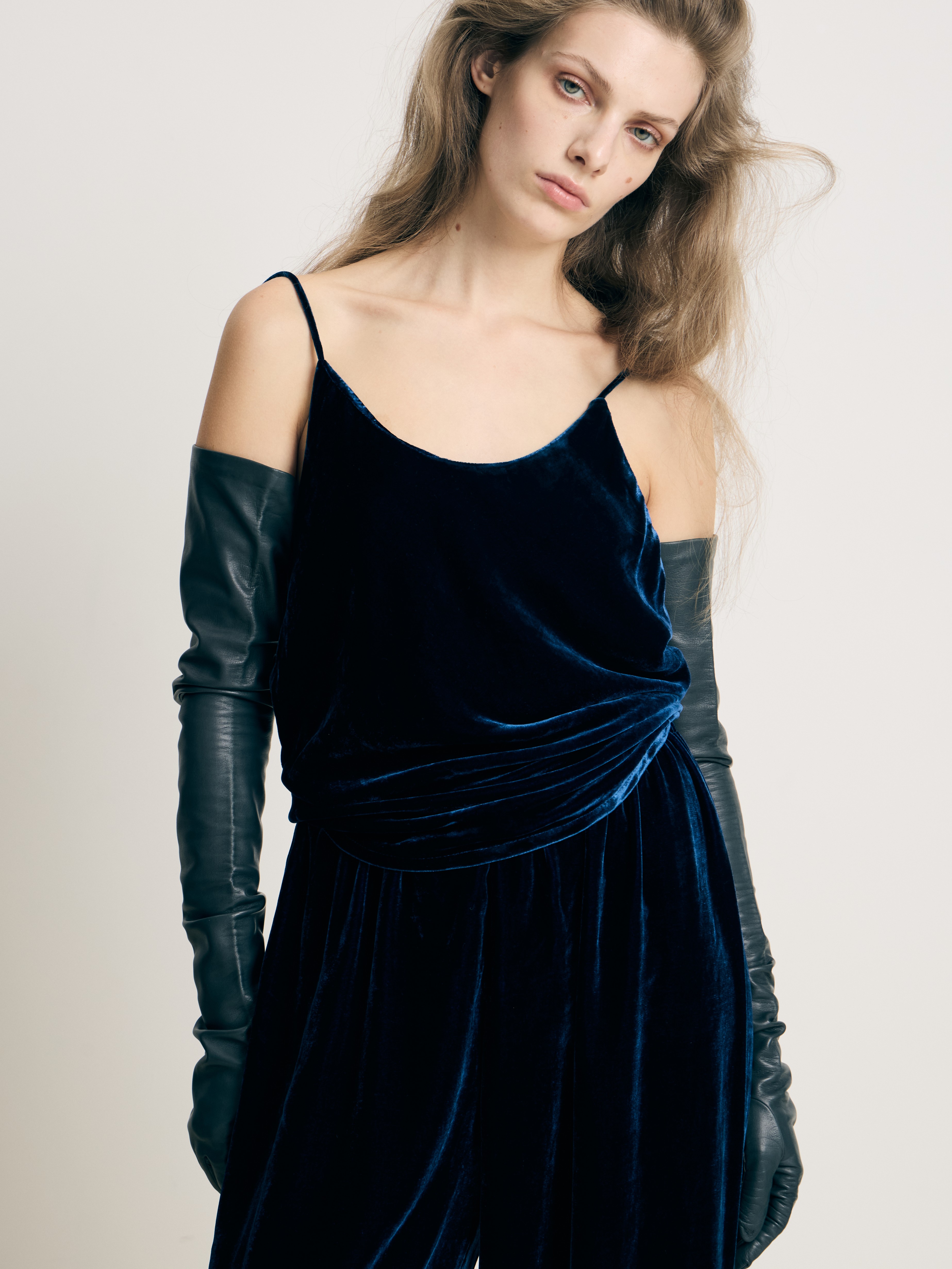 Бархатный комплект из топа и брюк в синем цвете. Топ с V-образным вырезом, подкладочной тканью и регулируемыми бретелями, благодаря которым можно менять глубину выреза. Свободные брюки со средней посадкой и мягкой резинкой выполнены из того же материала, что позволяет сформировать нарядный и комфортный образ.