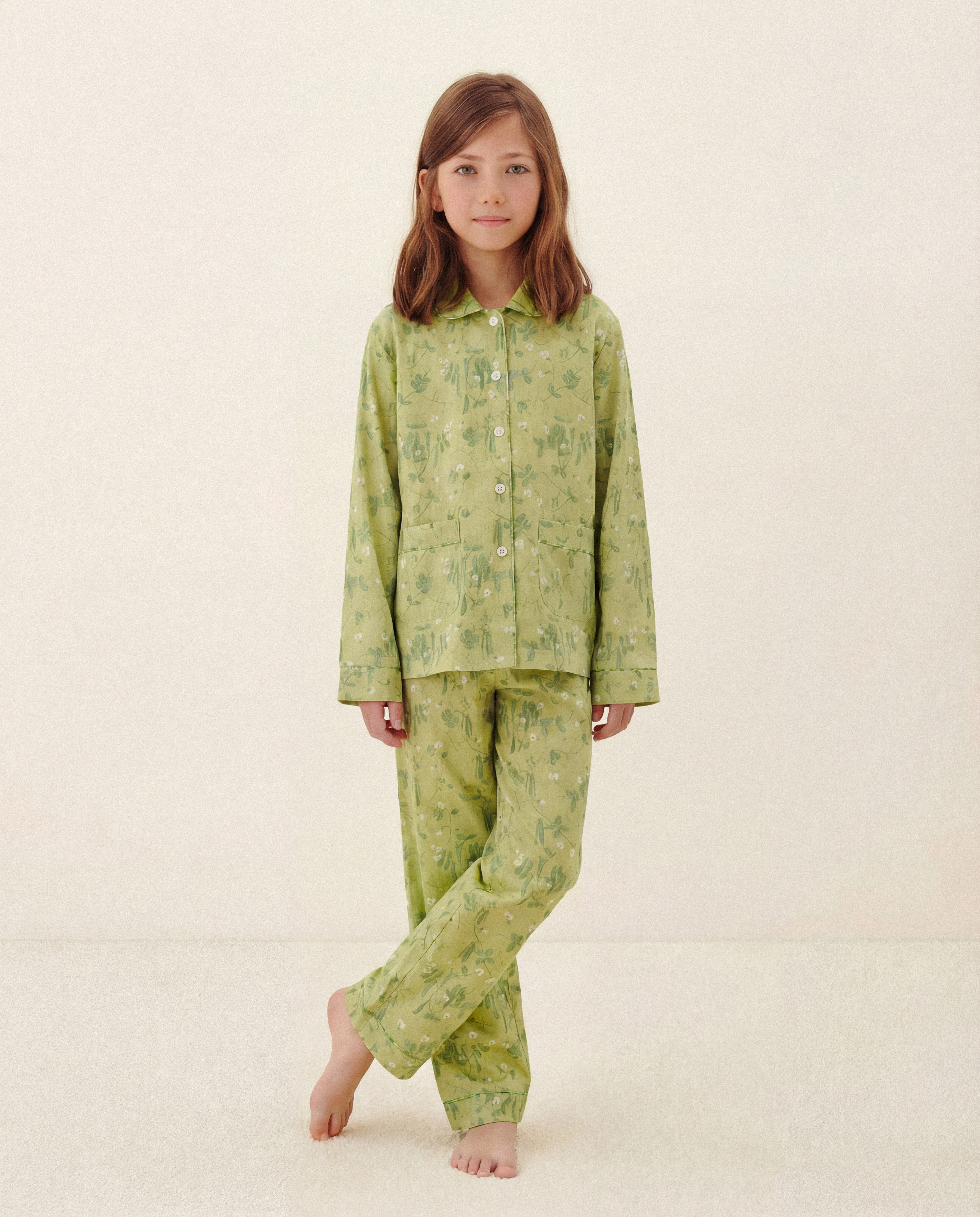 Детская пижама Pea с растительным принтом светло-зеленого цвета создана из натурального шелка премиального качества с заботой о чувствительной детской коже. Рубашка с длинными рукавами на пуговицах обеспечивает комфорт во время сна. На манжетах и воротнике возможно создание персональной вышивки с инициалами ребенка. Комплект подходит как для мальчиков, так и для девочек.