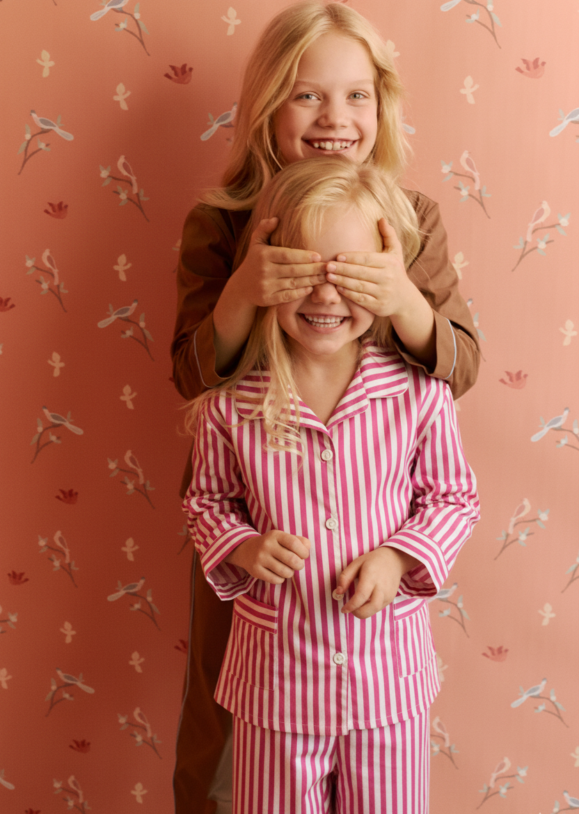 Детская пижама Roza с бело-розовыми вертикальными полосками изготовлена из премиального хлопка высочайшего качества с заботой о чувствительной детской коже. Классический дизайн с длинными рукавами и удобными брюками создает ощущение домашнего уюта во время сна. На манжетах и воротнике возможно создание персональной вышивки с инициалами ребенка. Превосходно сочетается с женским костюмом Roza.