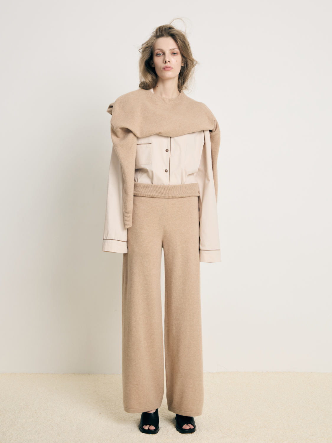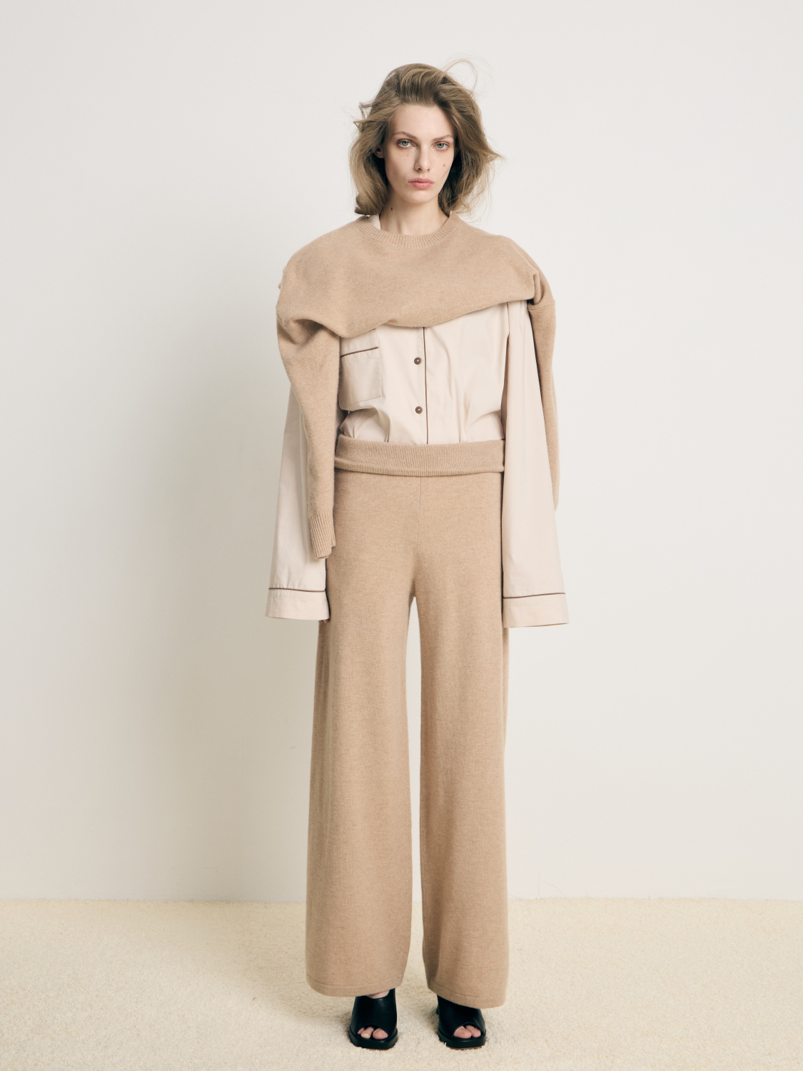 Прямые брюки с эластичным поясом и шнурком для комфортной посадки. Для формирования расслабленного образа выбирайте бежевую водолазку или топ из нашей трикотажной коллекции.
