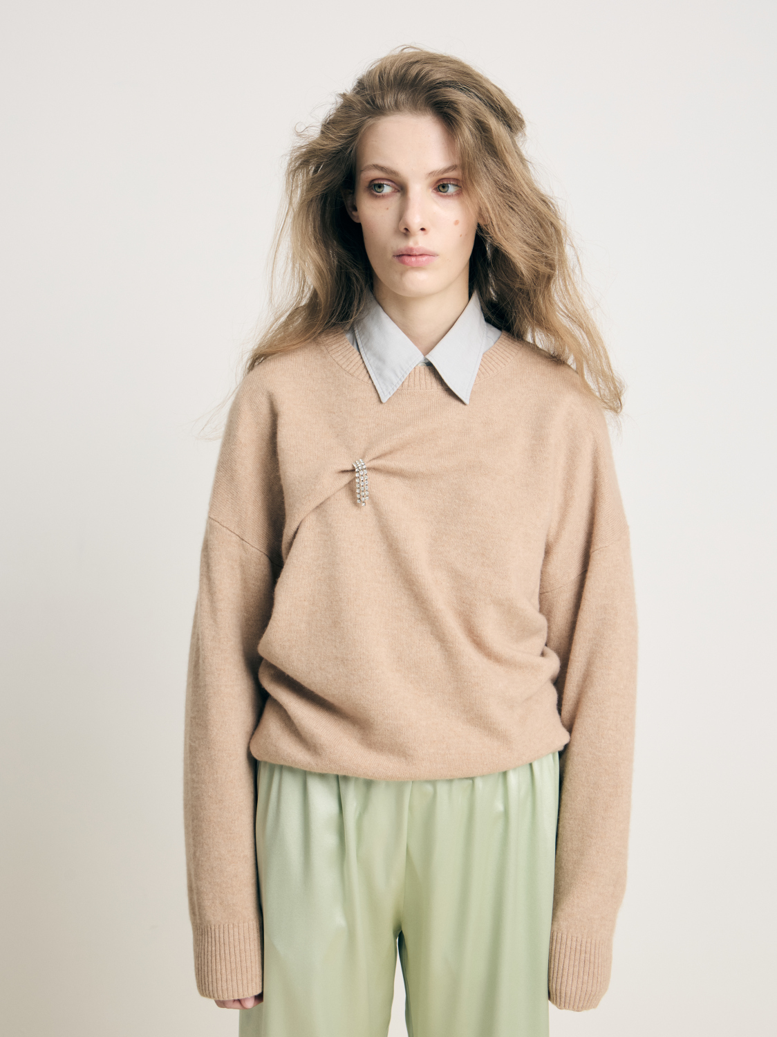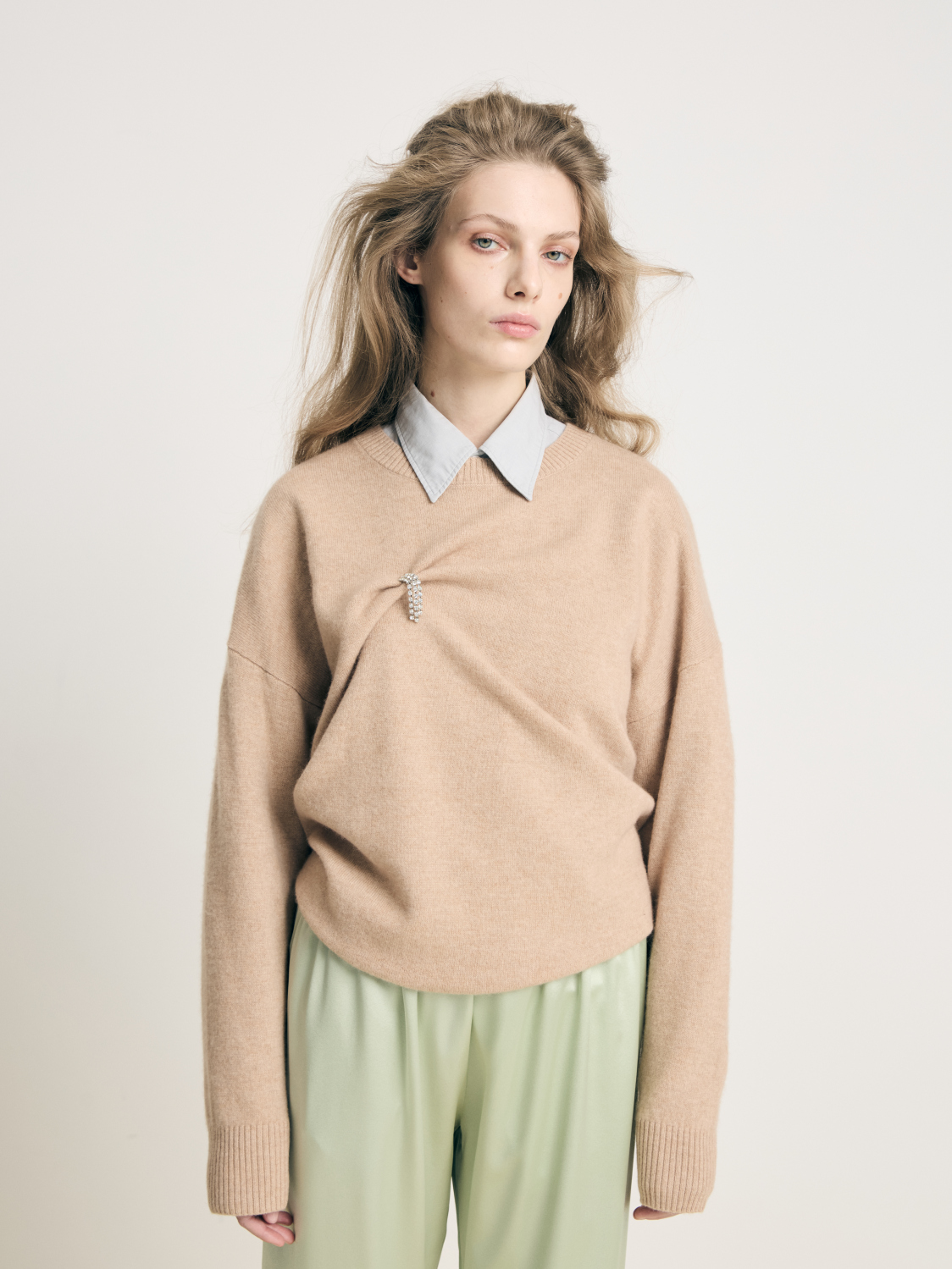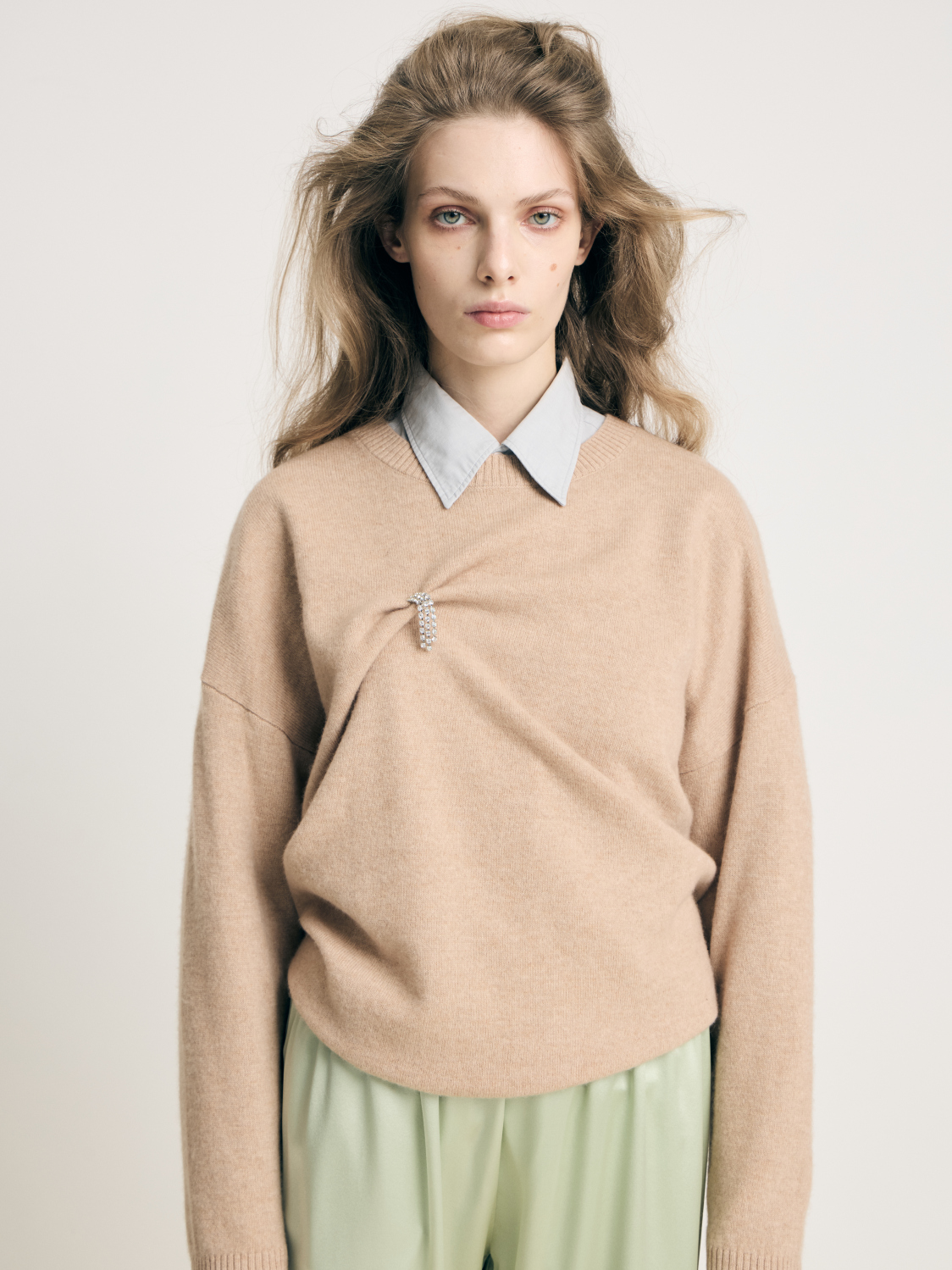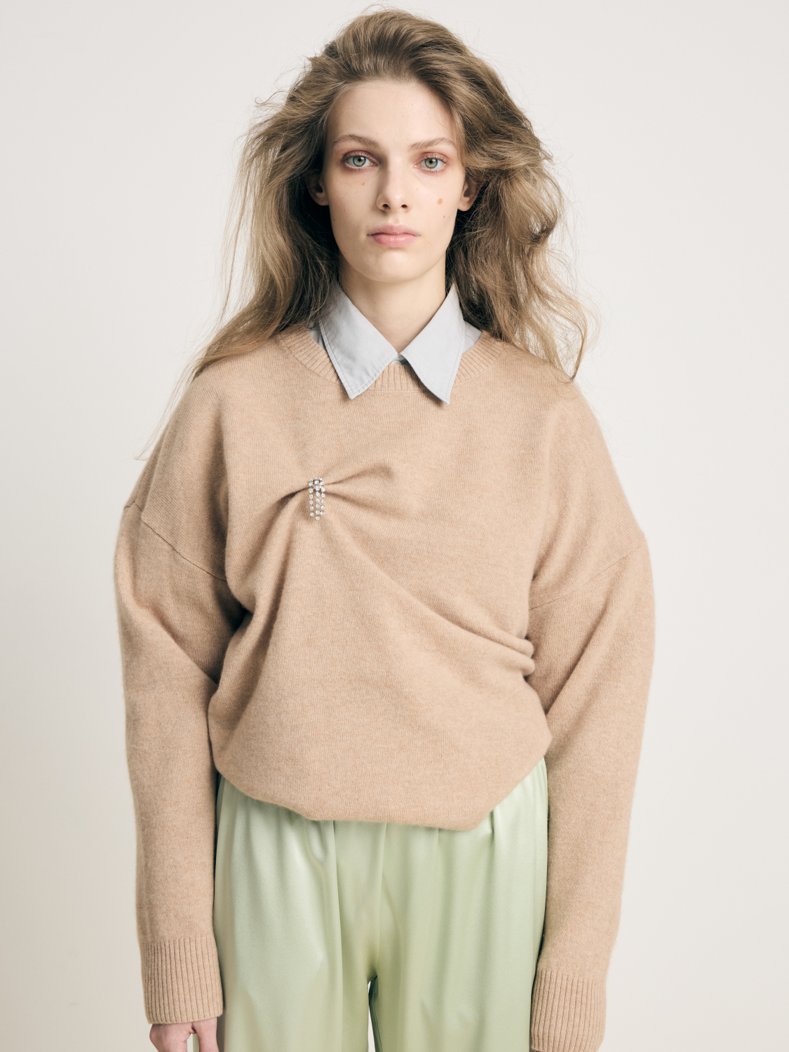 Бежевый кашемировый джемпер свободного силуэта с круглым вырезом и спущенной плечевой линией. Легкий и одновременно плотный джемпер сохраняет тепло и хорошо держит форму.