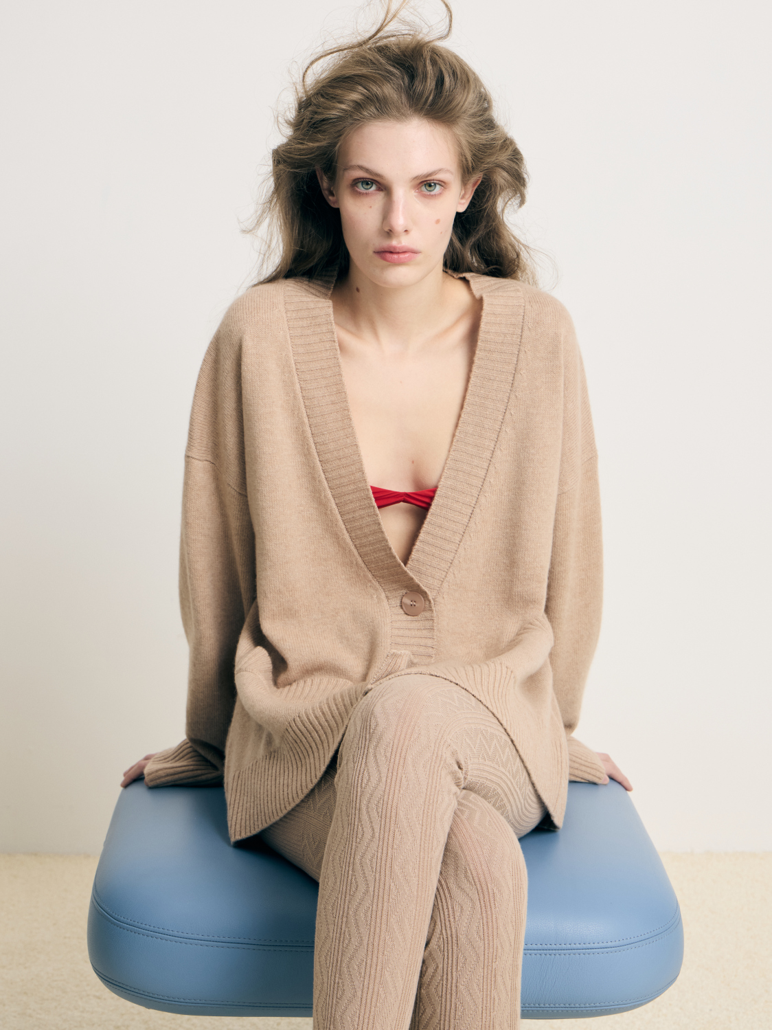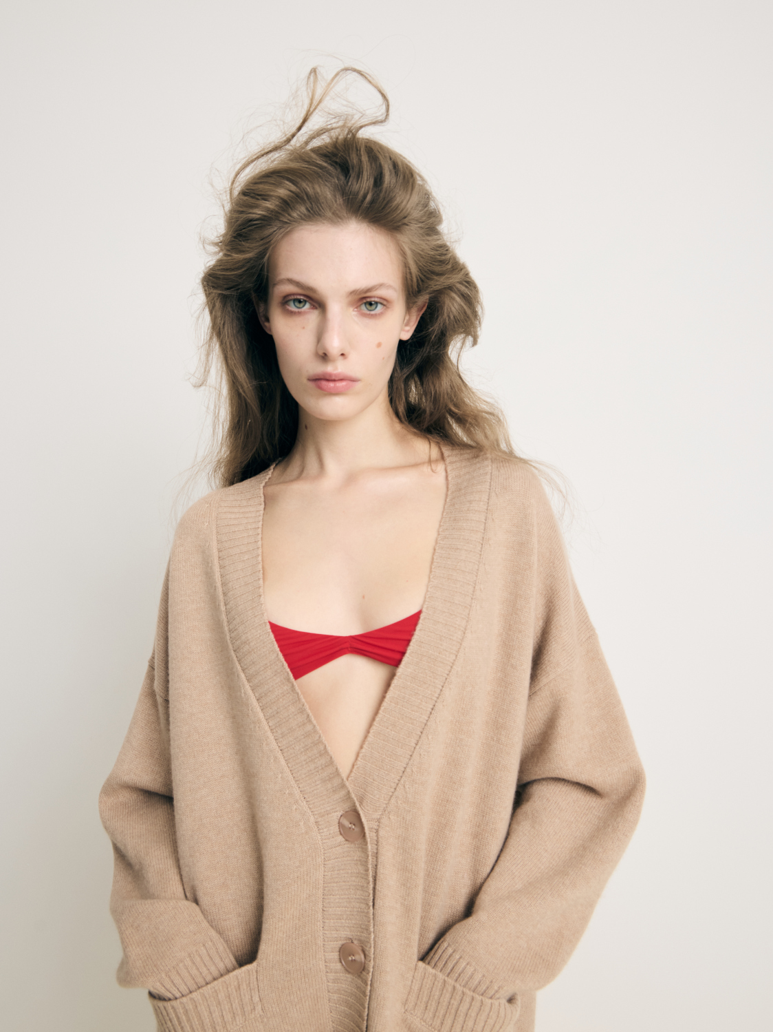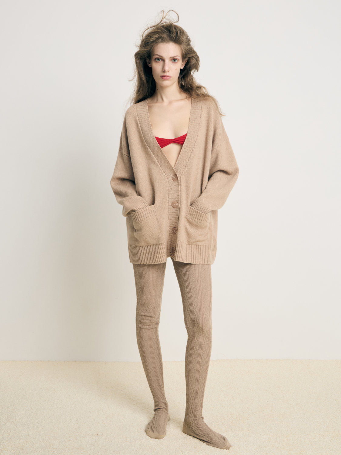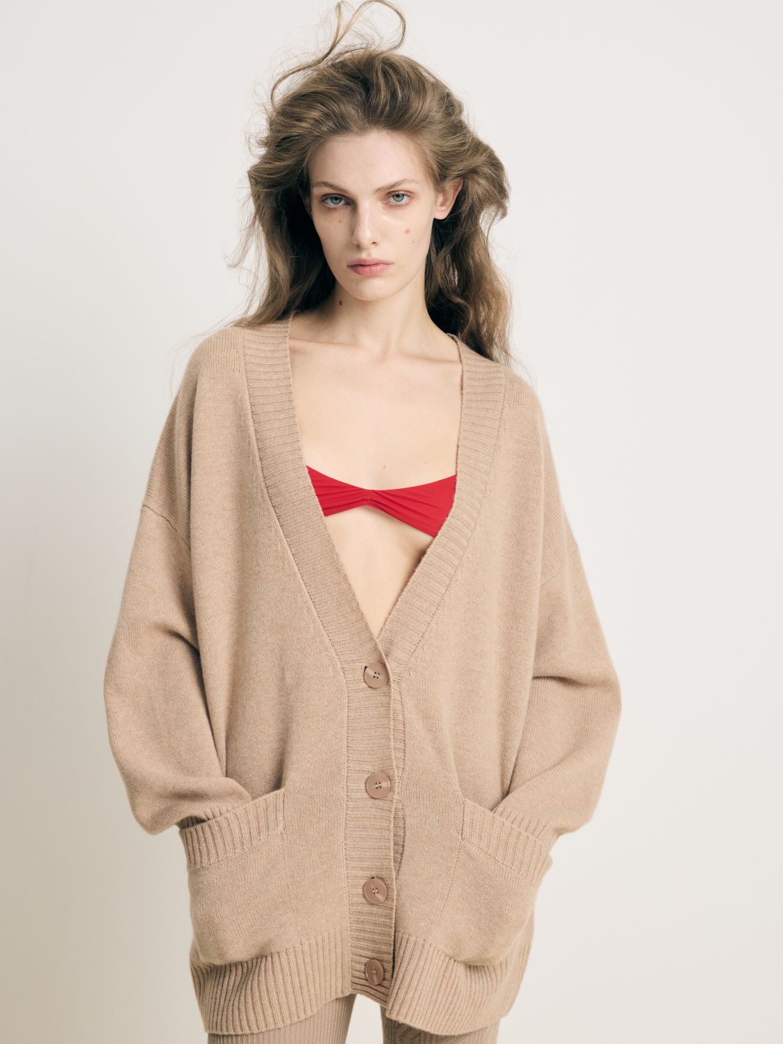 Бежевый кашемировый кардиган свободного кроя со спущенной плечевой линией, широкой резинкой на манжетах и по нижнему краю изделия.