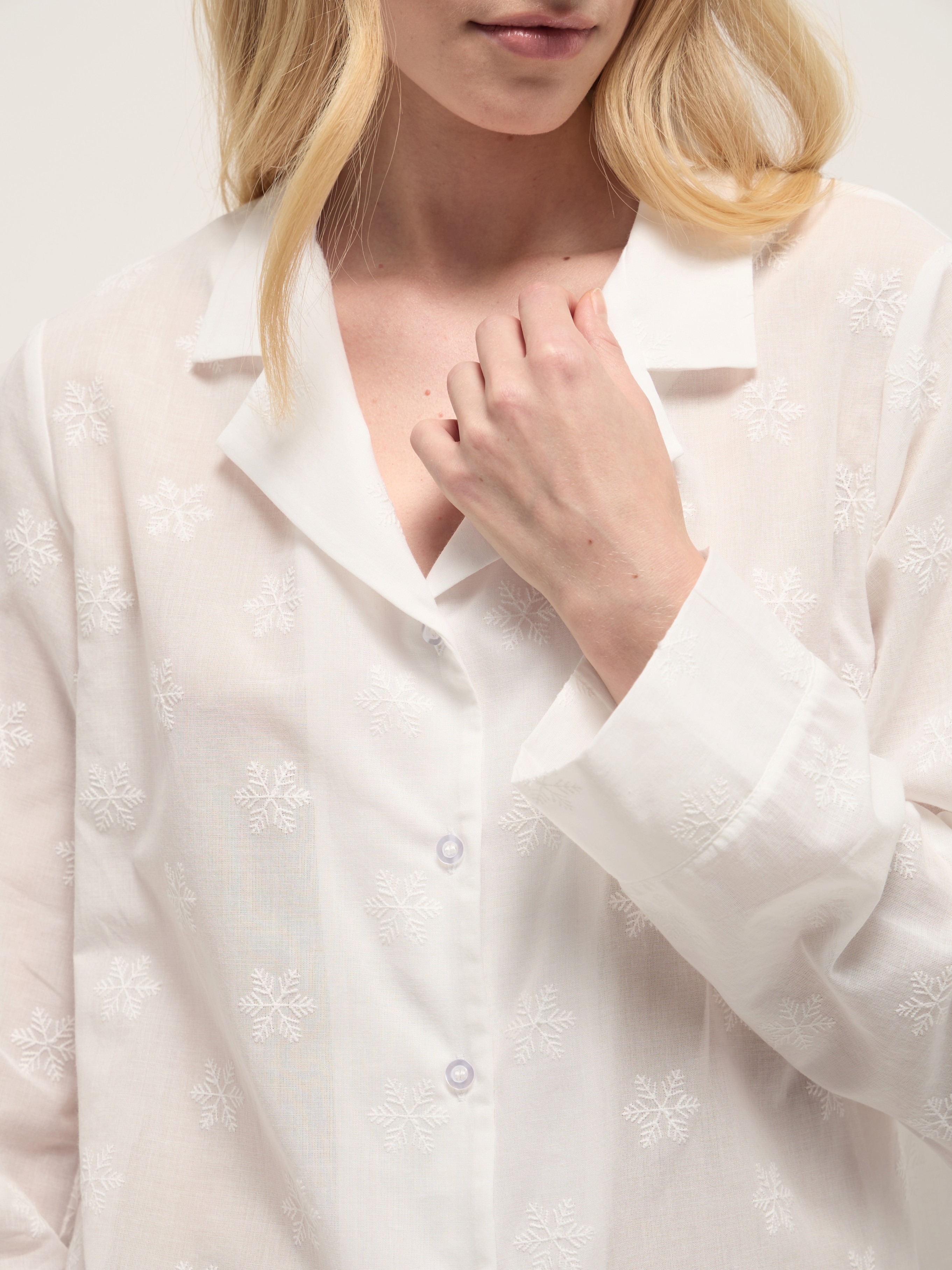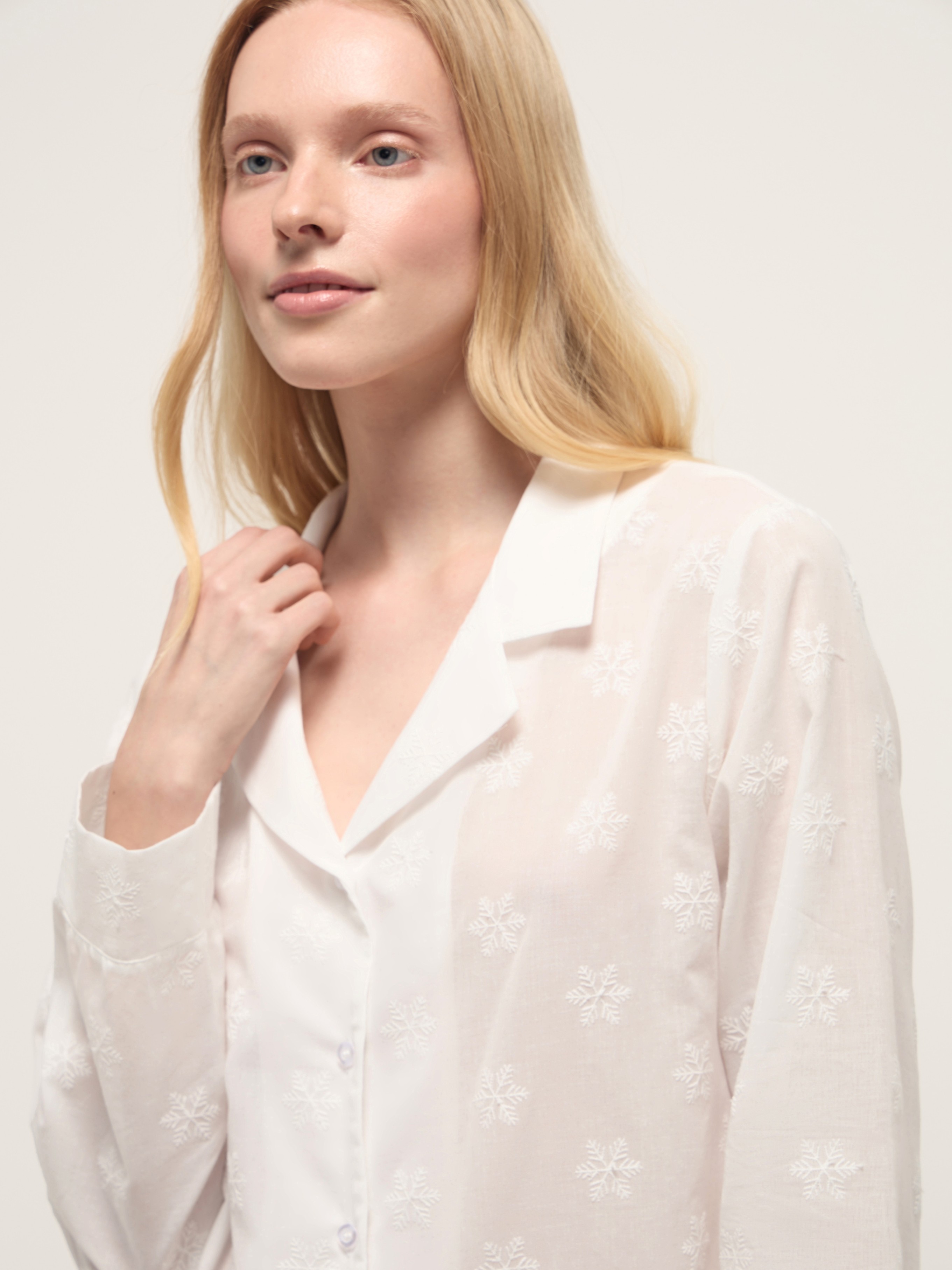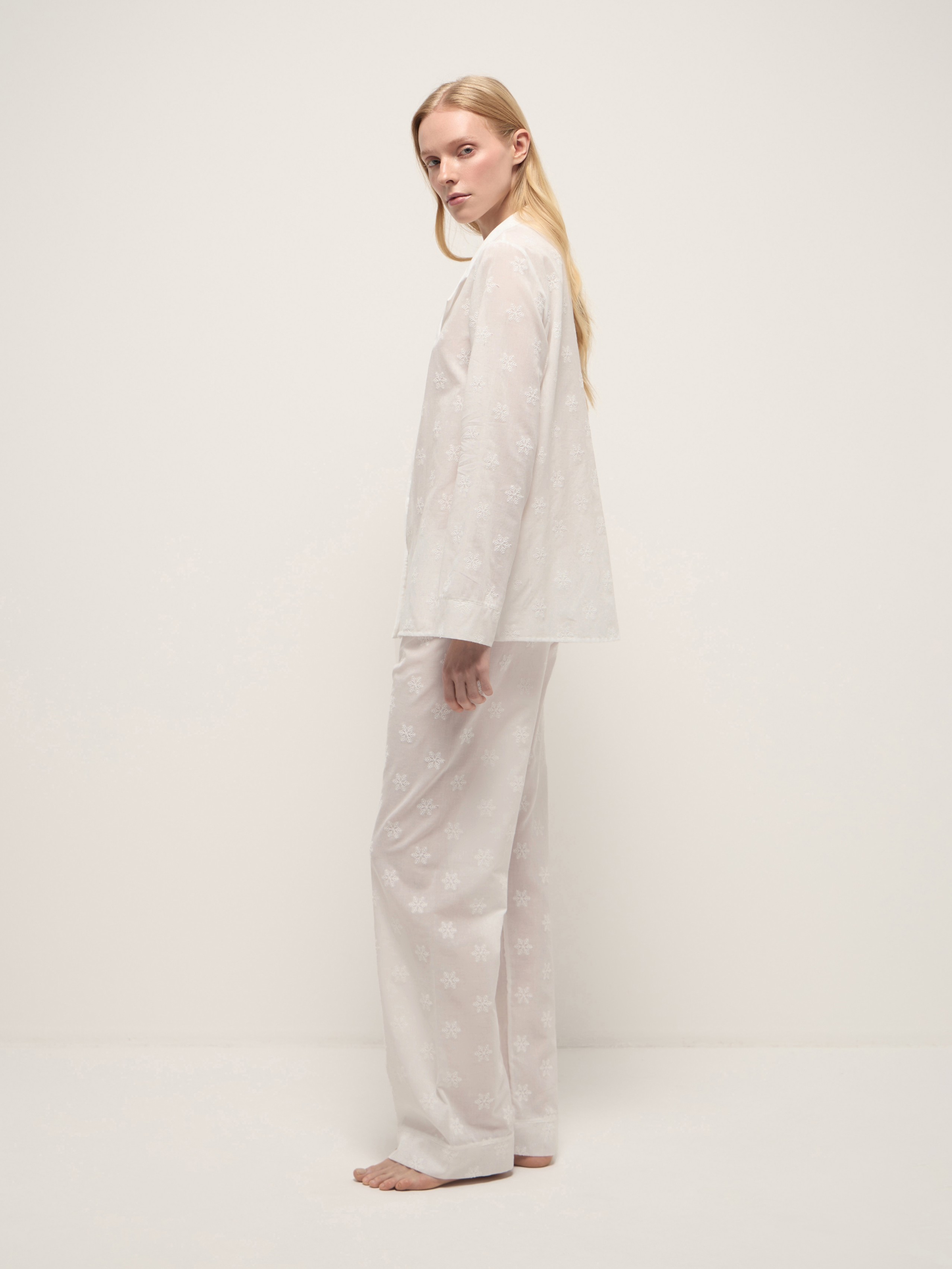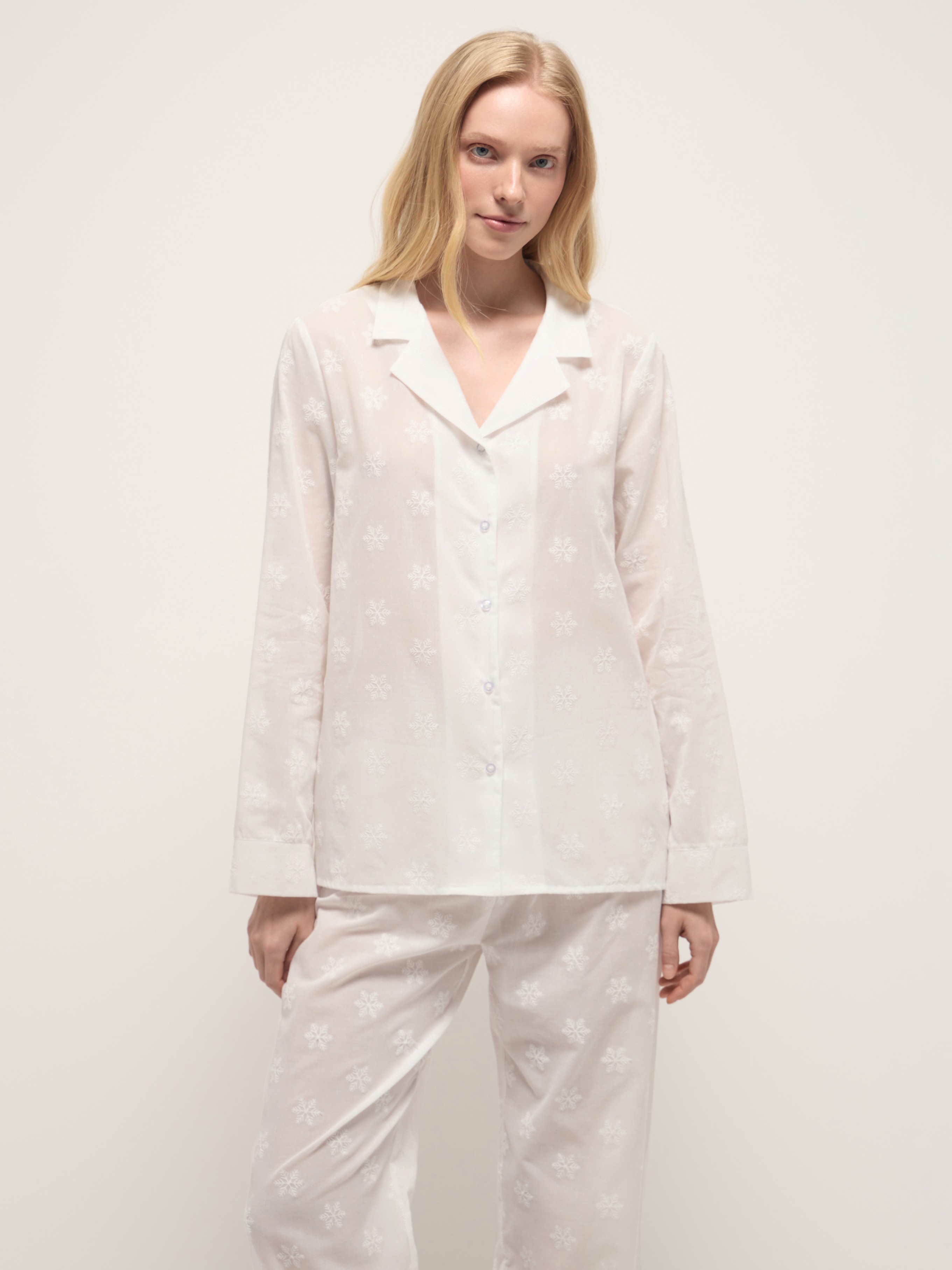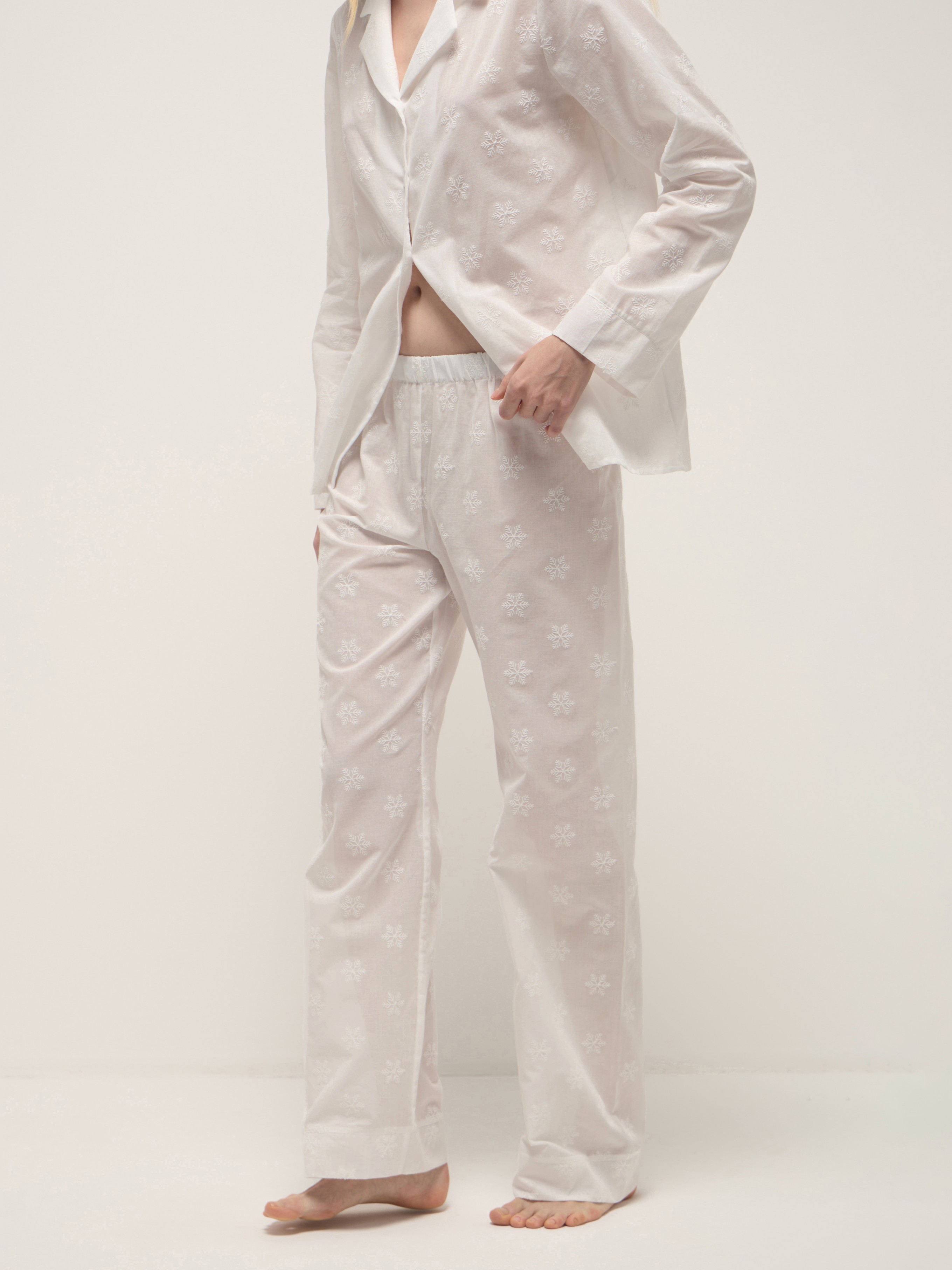 Белоснежный женский костюм из легкого батиста с вышивкой в виде снежинок. Рубашка с пуговицами и прямые брюки с эластичной резинкой выполнены из хлопкового материала, который пропускает воздух, а свободный крой не сковывает движения.