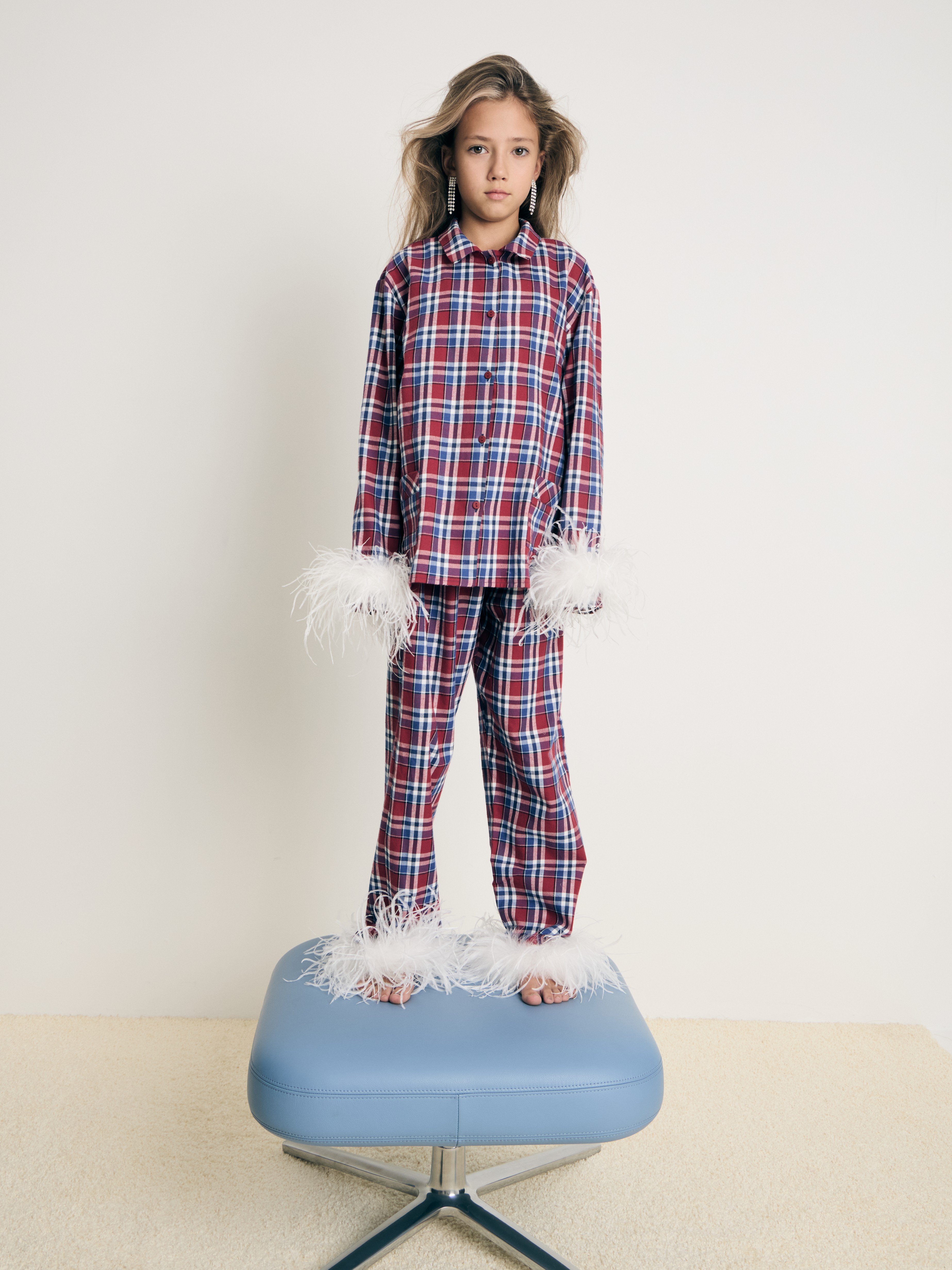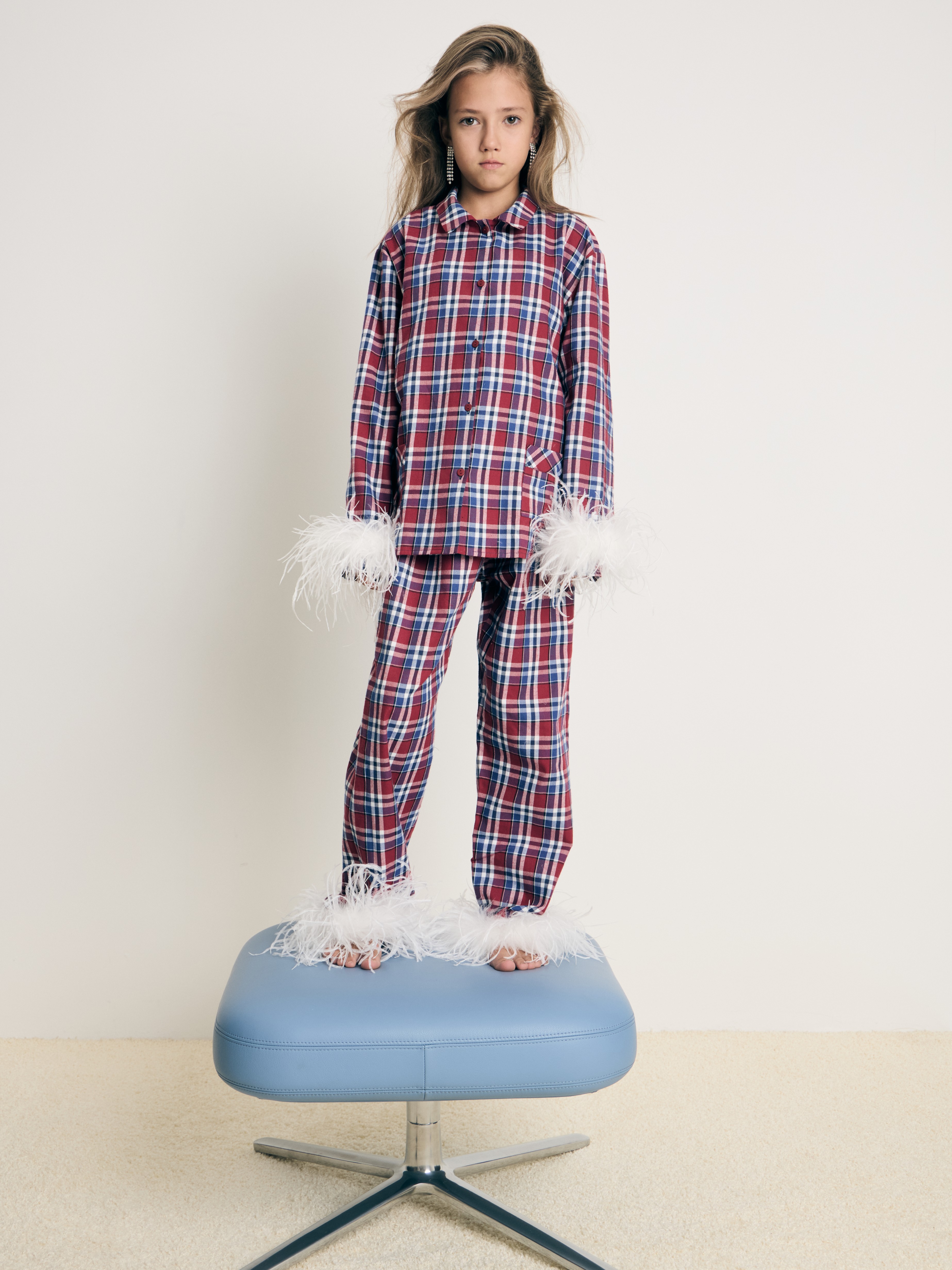 Детский домашний комплект в клетку из мягкой фланели— натурального хлопкового материала, который не растягивается и практически не мнется. Свободная рубашка с карманом на груди, пристегивающиеся к манжетам перья и прямые брюки с мягкой резинкой.