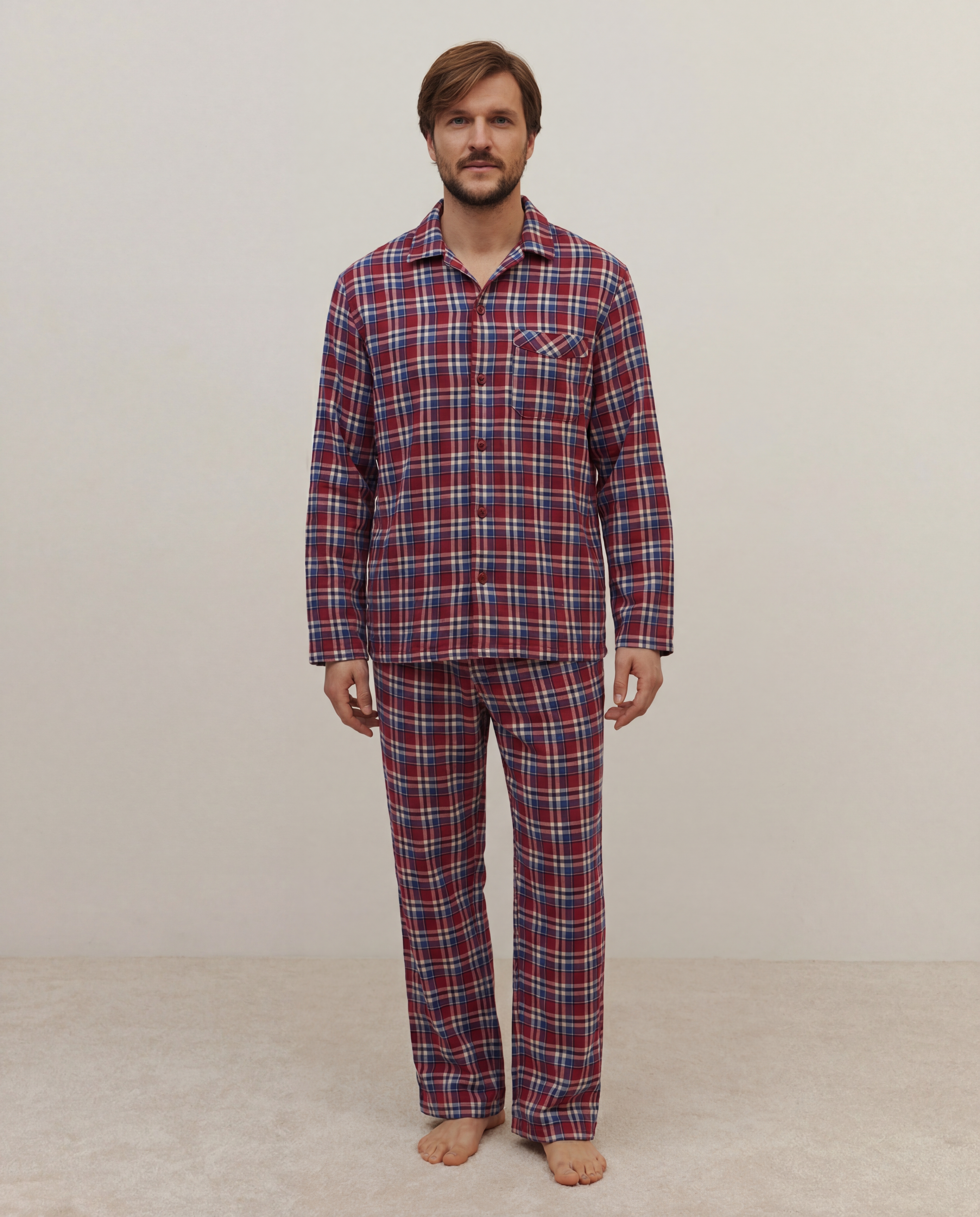 Мужской домашний комплект в клетку из фланели — натурального мягкого материала, который не растягивается и практически не мнется. Свободная рубашка с карманом на груди, круглым воротником и прямые брюки с мягкой резинкой.