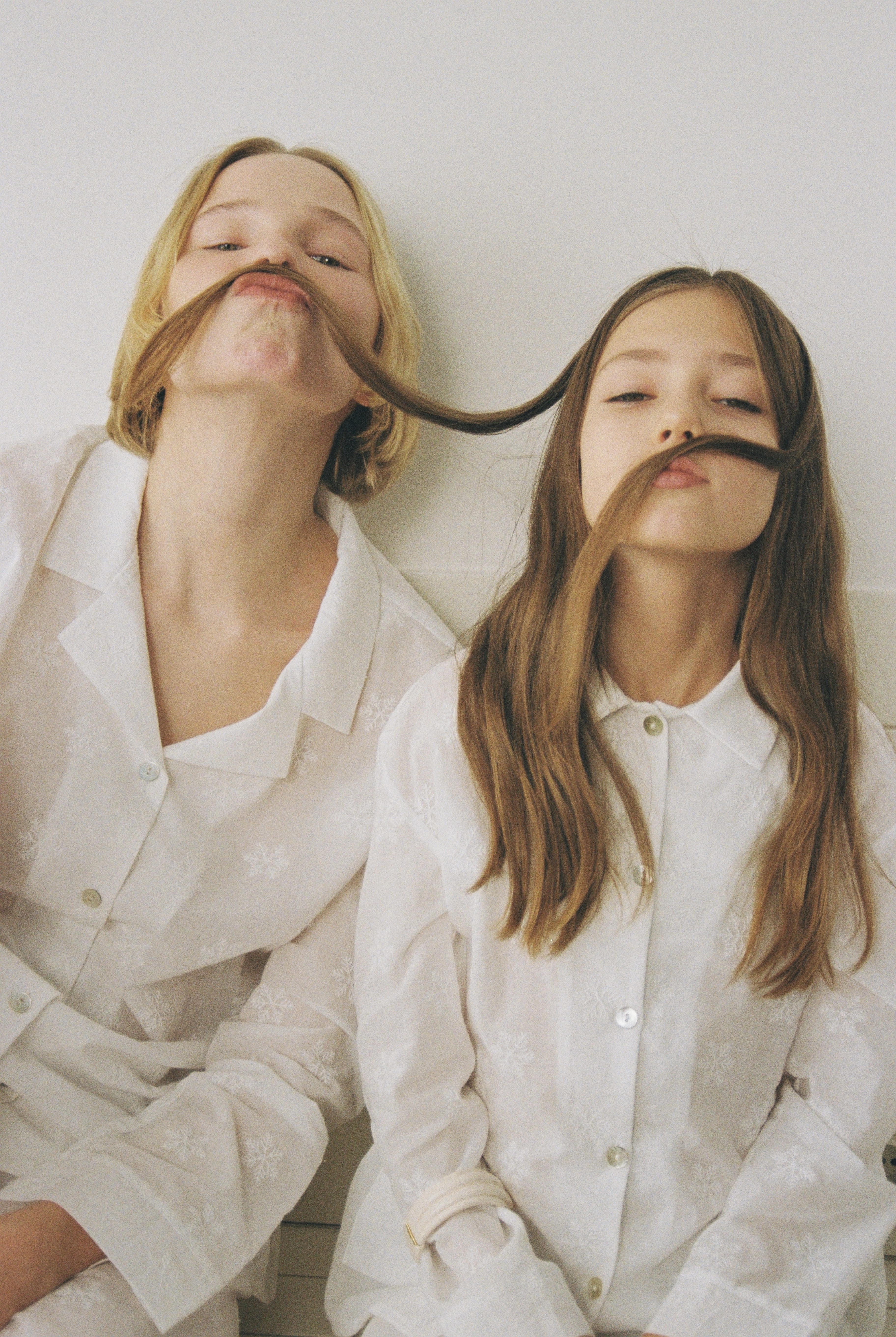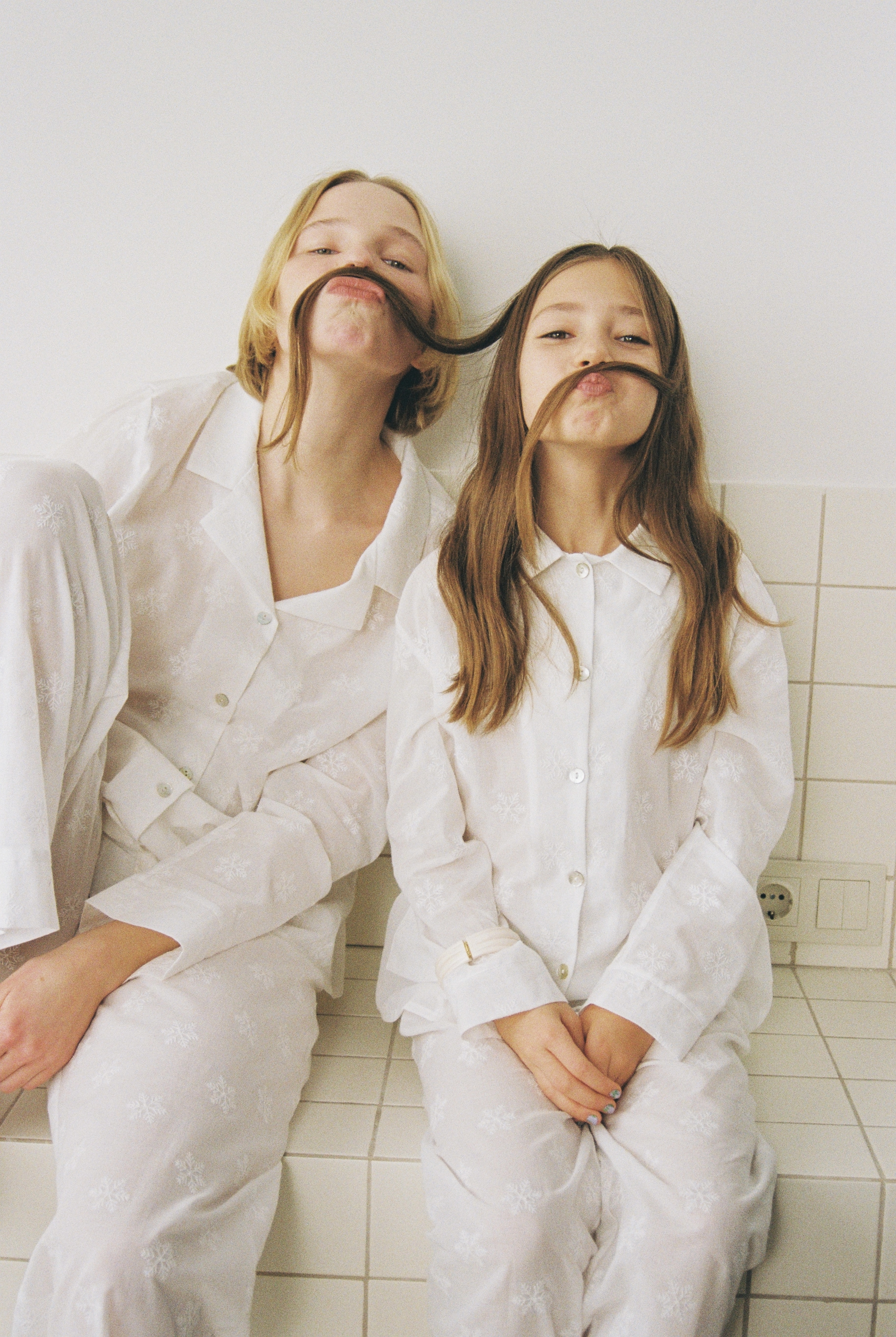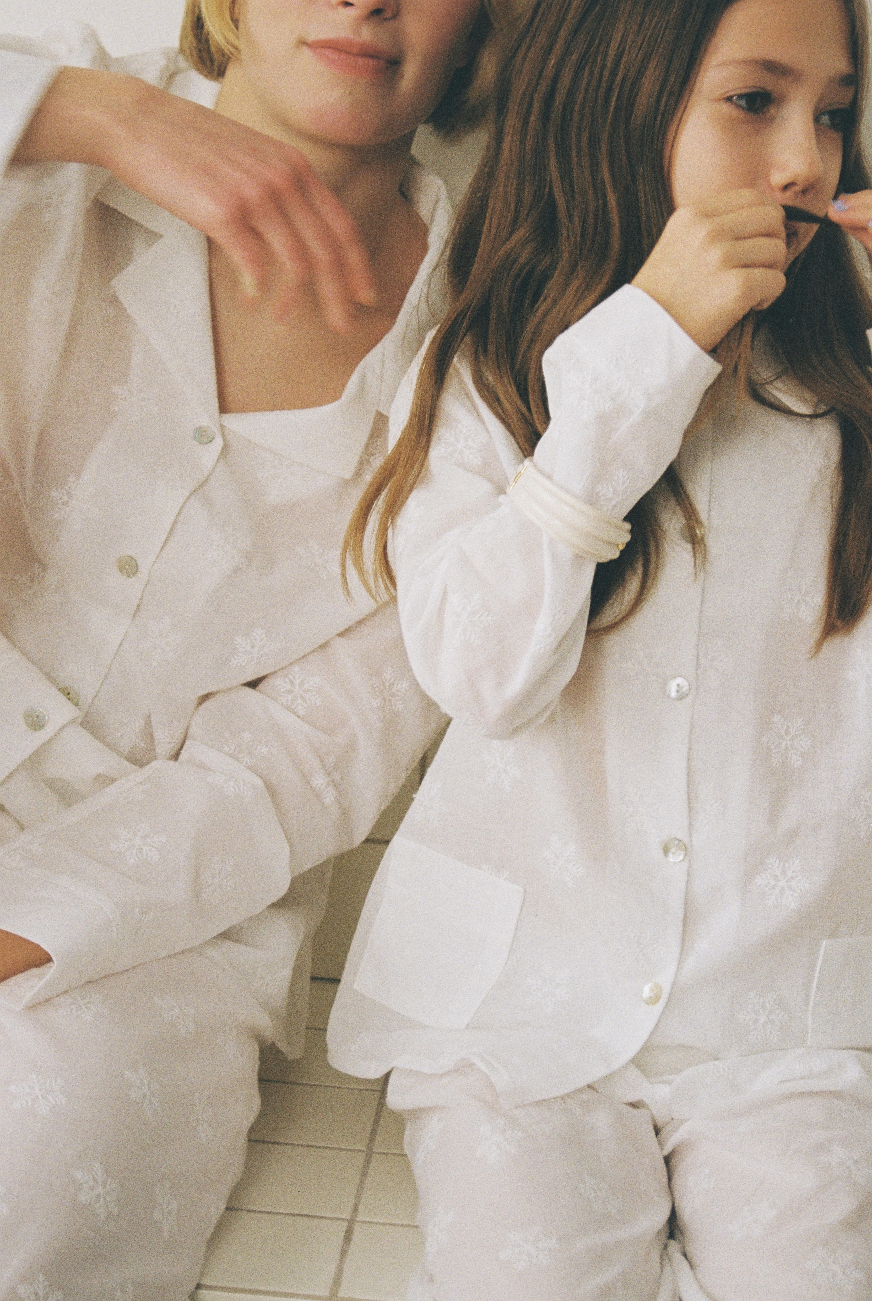 Белоснежный детский костюм из легкого батиста с вышивкой в виде снежинок. Рубашка с пуговицами и прямые брюки с эластичной резинкой выполнены из хлопкового материала, который пропускает воздух, а свободный крой не сковывает движения. Пижама подходит как для мальчиков, так и для девочек.