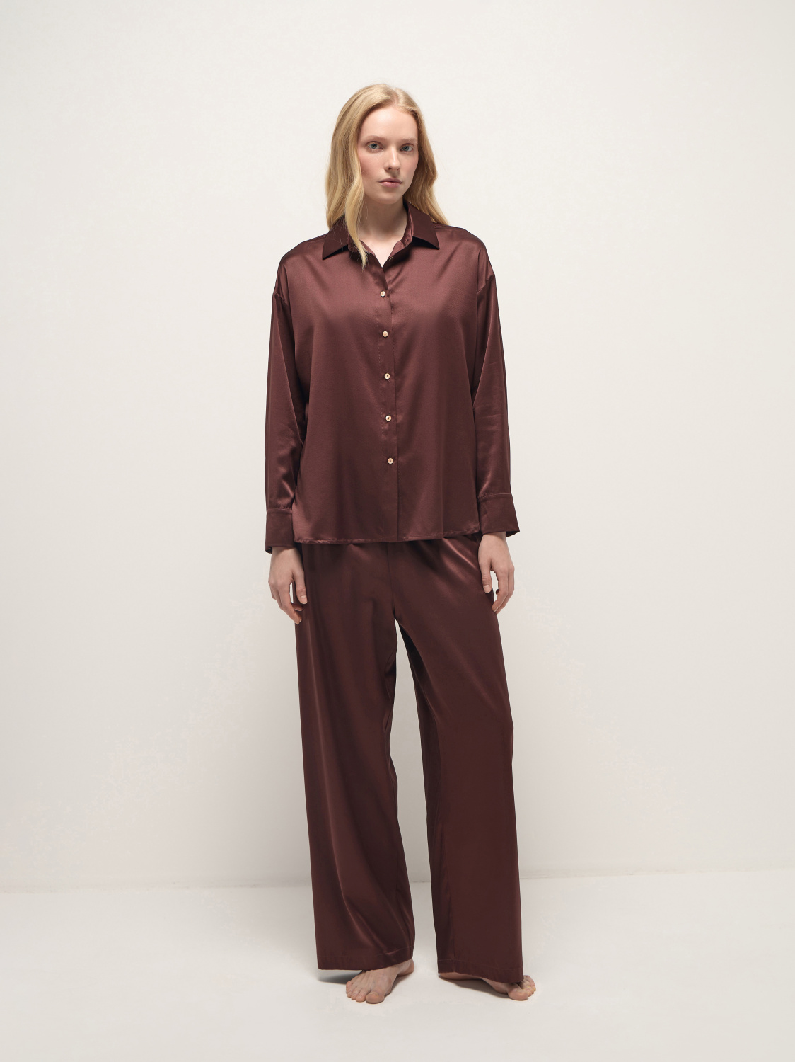 Женская пижама Lea в глубоком бордовом оттенке выполнена из натурального шелка премиального качества. Классический силуэт с отложным воротником и прямыми брюками обеспечивает идеальную посадку и комфорт во время сна. Благородная фактура материала подчеркивает элегантность модели, делая её особенным элементом домашнего гардероба.