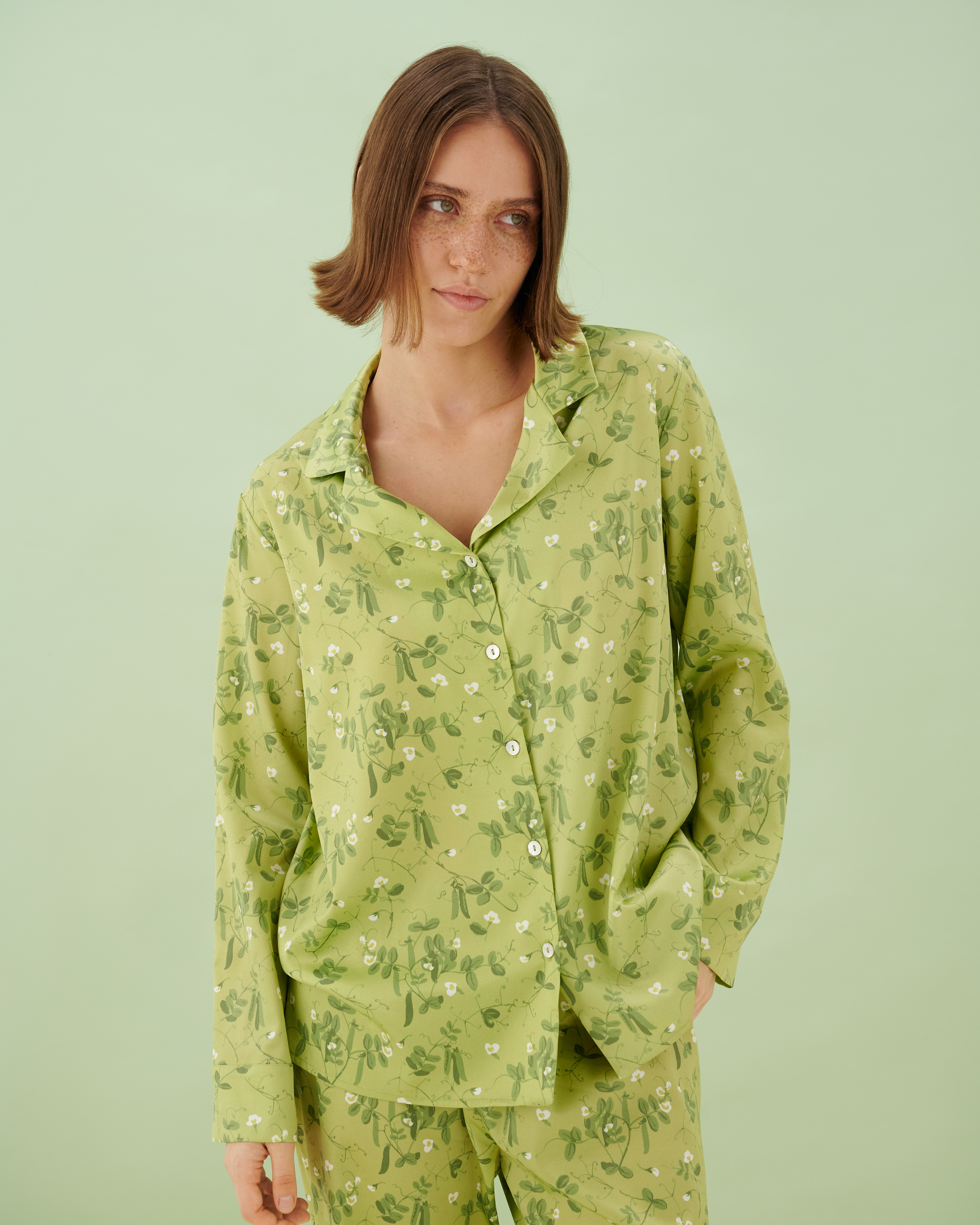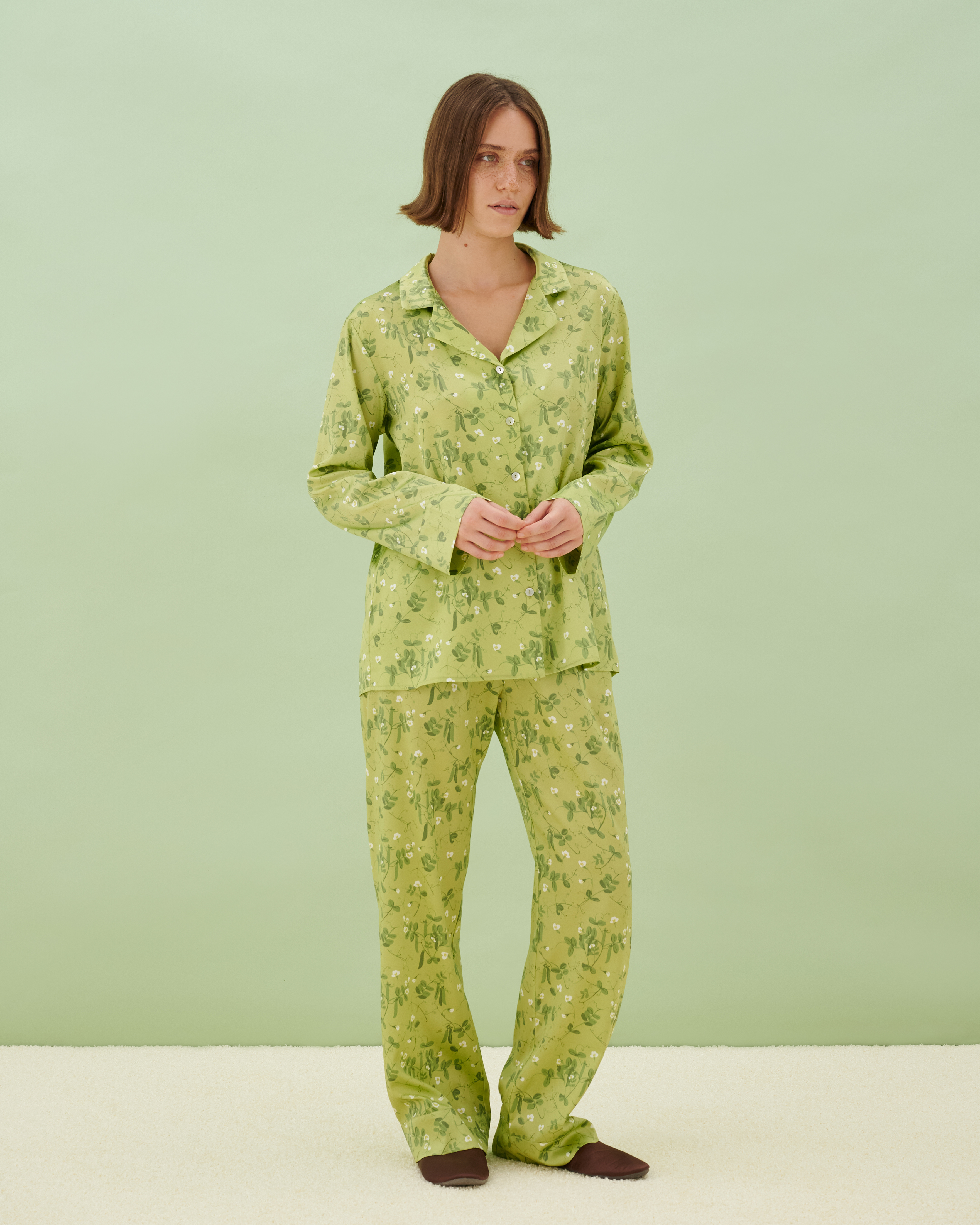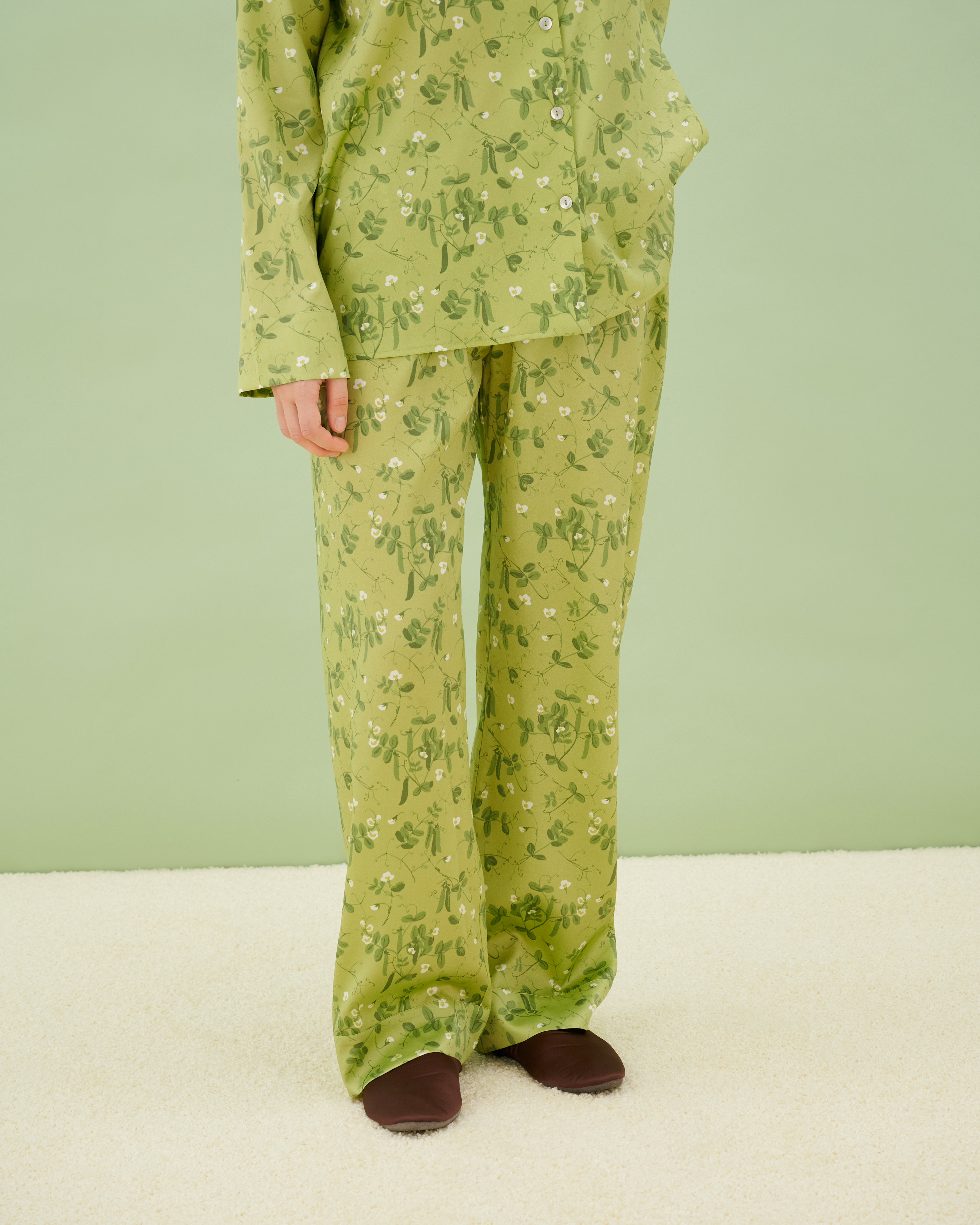Пижама шелковая Pea в нежно-зеленом оттенке с изящным цветочным принтом создана из натурального шелка премиального качества. Классический силуэт с отложным воротником и прямыми брюками обеспечивает идеальную посадку и естественность движений во время сна и отдыха. На манжетах и воротнике возможно создание персональной вышивки с инициалами или тонким орнаментом. Уникальный растительный узор и высокое качество материала делают эту модель особенным акцентом в гардеробе для домашнего отдыха.