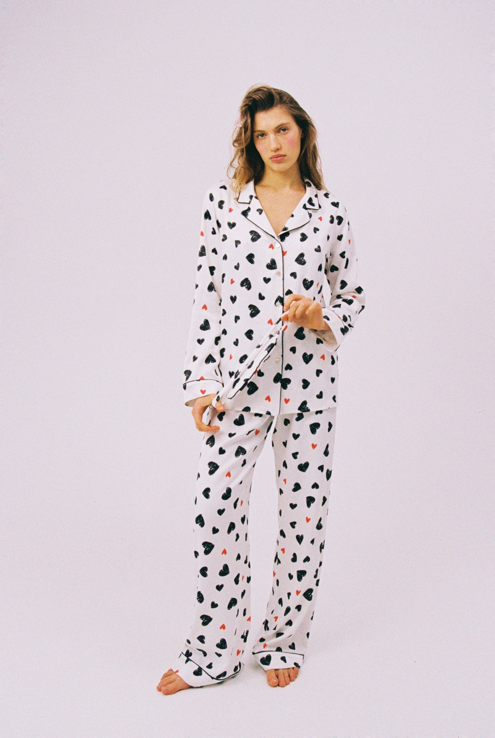 Женская пижама в светлом оттенке с игривым принтом сердечки выполнена из мягкой вискозы премиального качества. Свободный крой с длинными рукавами и прямыми брюками обеспечивает максимальную свободу движений. Шелковистая вискозная ткань приятно охлаждает кожу и создает ощущение легкости во время домашнего отдыха.